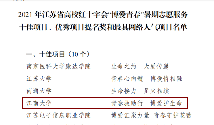 近日,由江苏省红十字会、省文明办、省教育厅等7个部门和单位联合开展的2021年全省高校红十字会“博爱青春”暑假志愿服务项目展示评选会顺利举办。开元(中国)官方网站登录界面“青春救助行,博爱护生命”志愿服务项目以优异的成绩在58所高校集中展示的60个比赛项目中脱颖而出,第七次获得江苏省十佳项目荣誉!