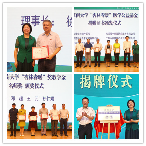 会上,社会资源处处长黄敏宣读了《江南大学“杏林春暖”医学公益基金成立的决定》,附属医院院长华东宣读了《江南大学“杏林春暖”医学公益基金章程(草案)》,徐岩副校长宣读了基金理事会建议名单并颁发聘书,刘霞副市长和陈卫校长一起为基金揭牌,并为捐赠企业和个人颁发了基金捐赠证书。