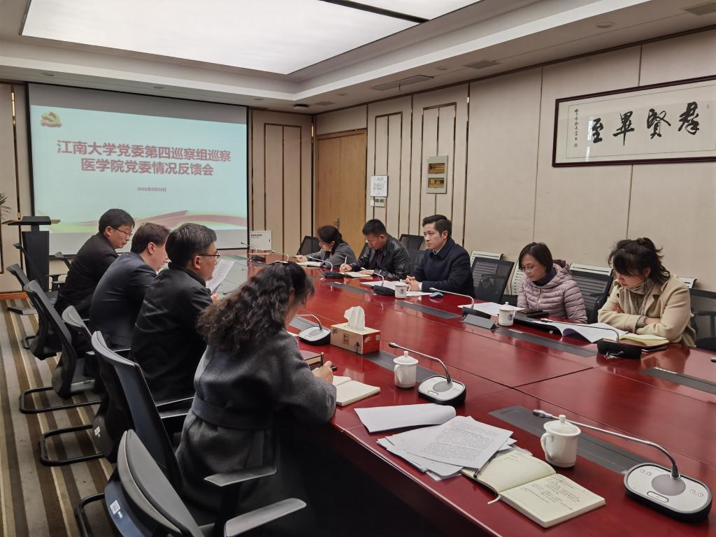 2021年3月22日下午,根据学校党委巡察工作统一部署,江南大学党委第四巡察组巡察医学院党委反馈会在无锡医学院C106会议室、C101报告厅举行,校纪委副书记、党委巡察工作领导小组办公室主任丁文勤同志,巡察组副组长、校党委委员、生物工程学院党委书记王维同志,巡察组成员、图书馆与档案馆党总支书记曹瑛同志,巡察组成员、国际教育学院 北美学院党委书记陈琳同志,巡察组联络员、药学院党委专职组织员葛玲同志,无锡医学院党组织领导班子成员、党委委员、党政管理科级干部、教授、青年教师等教职工代表参加了会议。会议由无锡医学院院长马鑫主持。