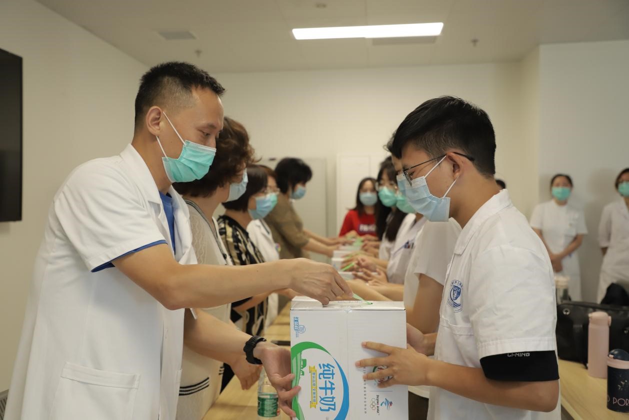 7月21日下午,在附属医院副院长曹宏、教育处处长徐德武老师的陪同下,医学院党委书记向琪,党委副书记、副院长奚晓岚,以及班主任、辅导员老师们来到附属医院,看望与慰问暑假在岗师生,并与相关科室的带教老师和同学们进行了座谈交流,了解初入实习的同学们的实习、生活情况,聆听师生们的心声,并送上鲜花、牛奶等慰问品,鼓励同学们积极认真参与临床实习、注意疫情防控和暑期安全。