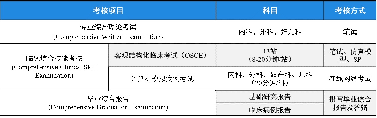 创新性实施“3C”(Comprehensive)模式的毕业综合考核,内容包括专业综合理论考试、临床综合技能考核和毕业综合报告。考察学生对专业知识的理解和应用能力、临床技能操作水平、临床思维、科研思维、分析问题和解决问题的能力。