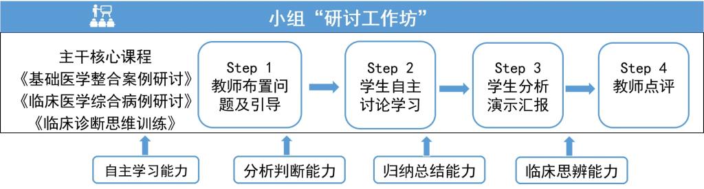 主干核心课程设置讨论环节,同时开设专题研讨类课程,共同组成“研讨工作坊”,在实施小班化授课过程中,将学生分成4-5人讨论小组,进行基于临床实际问题的深层次互动学习讨论,基础与临床教师共同指导、点评,引导和激发主动学习意识,培养归纳分析、临床思辨能力。
