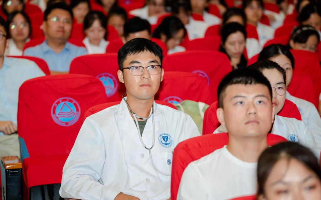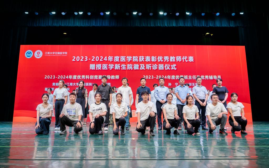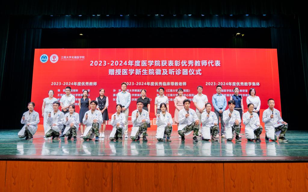 2023-2024学年医学院优秀教师、优秀临床带教老师、优秀教学集体、优秀科创指导教师、优秀班主任、优秀辅导员代表共同为本科生、研究生新生代表佩戴“江南医学人”院徽、授予听诊器。