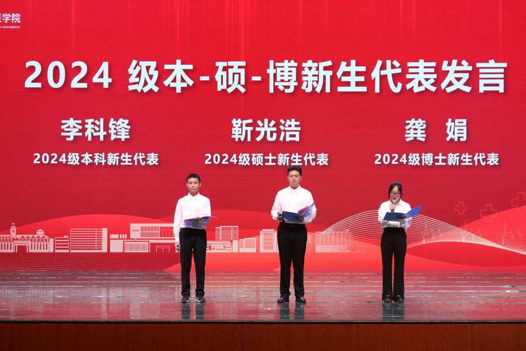 2024级新生代表临床医学专业(5+3)本科生李科锋、硕士生靳光浩、博士生龚娟从自身成长经历出发,共同讲述寻来时根、圆江南梦、问未来路的医学之旅,强烈表达了“江南医学人”牢记医学使命,践行医学誓言的责任感、认同感和归属感,并代表全体新生表态:未来将长志气、增骨气、厚底气,以厚德博学立身、以勤学明道立世、以精诚济世立业。