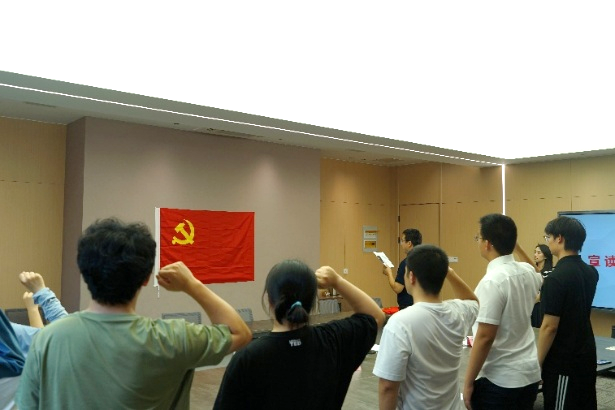 仪式在雄壮的《国际歌》中拉开帷幕。随后,党委专职组织员王恒老师宣读了新党员名单,包羽副书记和王恒老师共同为新党员佩戴党员徽章,标志着他们正式加入中国共产党。在领誓人王恒老师的带领下,面向鲜红的党旗,高举右拳,齐声宣誓。“我志愿加入中国共产党,拥护党的纲领,遵守党的章程,履行党员义务,执行党的决定……永不叛党。”誓言铮铮,表达了为共产主义事业奋斗终身的坚定决心。