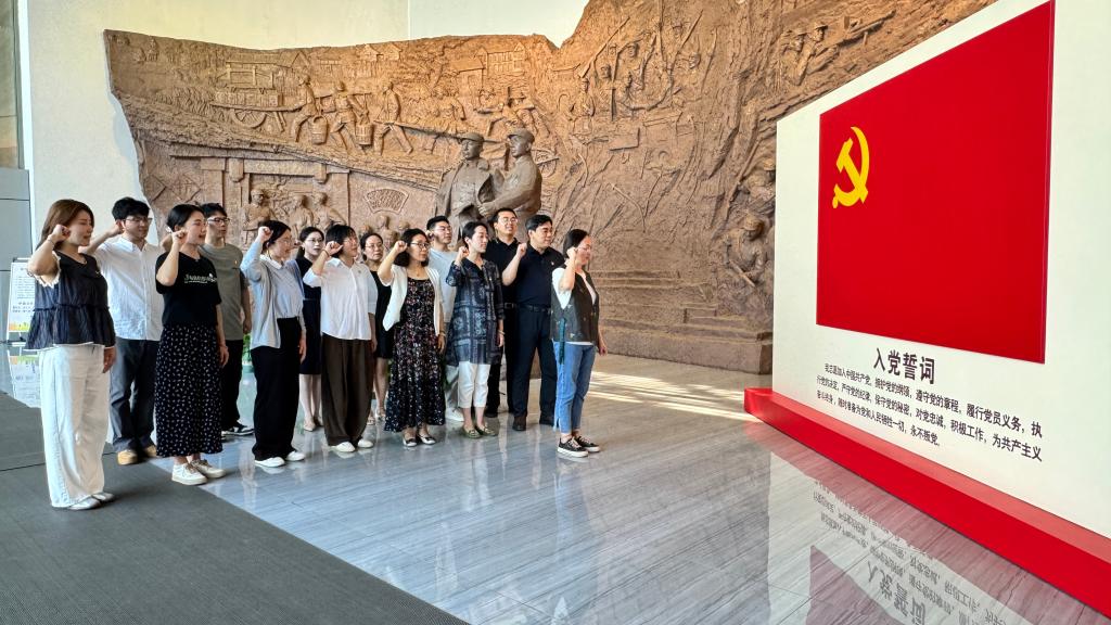在黄桥战役纪念馆庄严肃穆的展厅内,全体党员整齐列队,面向鲜红党旗,在党委书记向琪同志的带领下,高举右拳,重温入党誓词。“我志愿加入中国共产党……”铿锵有力的誓言响彻场馆,字字千钧,既是全体党员对党的生日最庄重的献礼,也是对理想信念的再次淬炼与升华。这一刻,入党时的澎湃激情与庄严承诺在每个人心中激荡,提醒着每一位党员时刻牢记身份,永葆先进本色。