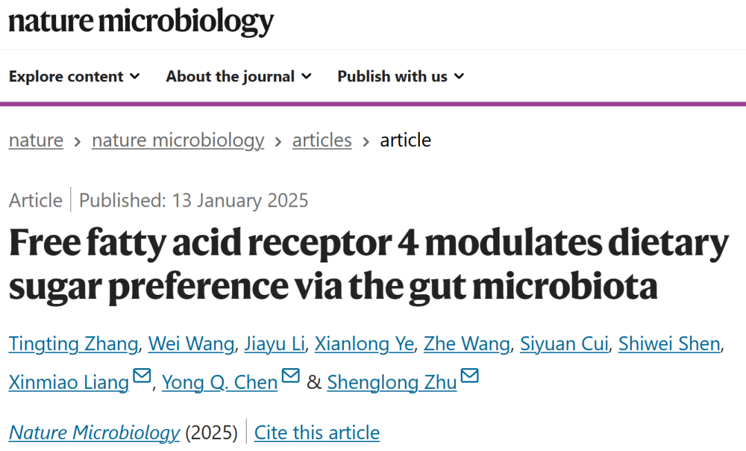 糖类物质的过度摄入偏好是推动糖尿病发病率上升的重要因素。这种饮食倾向的形成涉及复杂的肠-脑信号传导机制,其中肠道微生物群落可能扮演关键调控角色。2025年1月,江南大学陈永泉与朱升龙课题组在《Nature Microbiology》(IF:20.5)发表重要研究成果:Free fatty acid receptor 4 modulates dietary sugar preference via the gut microbiota。,阐明了游离脂肪酸受体4(Ffar4)通过肠道菌群调控糖类偏好的分子机制。